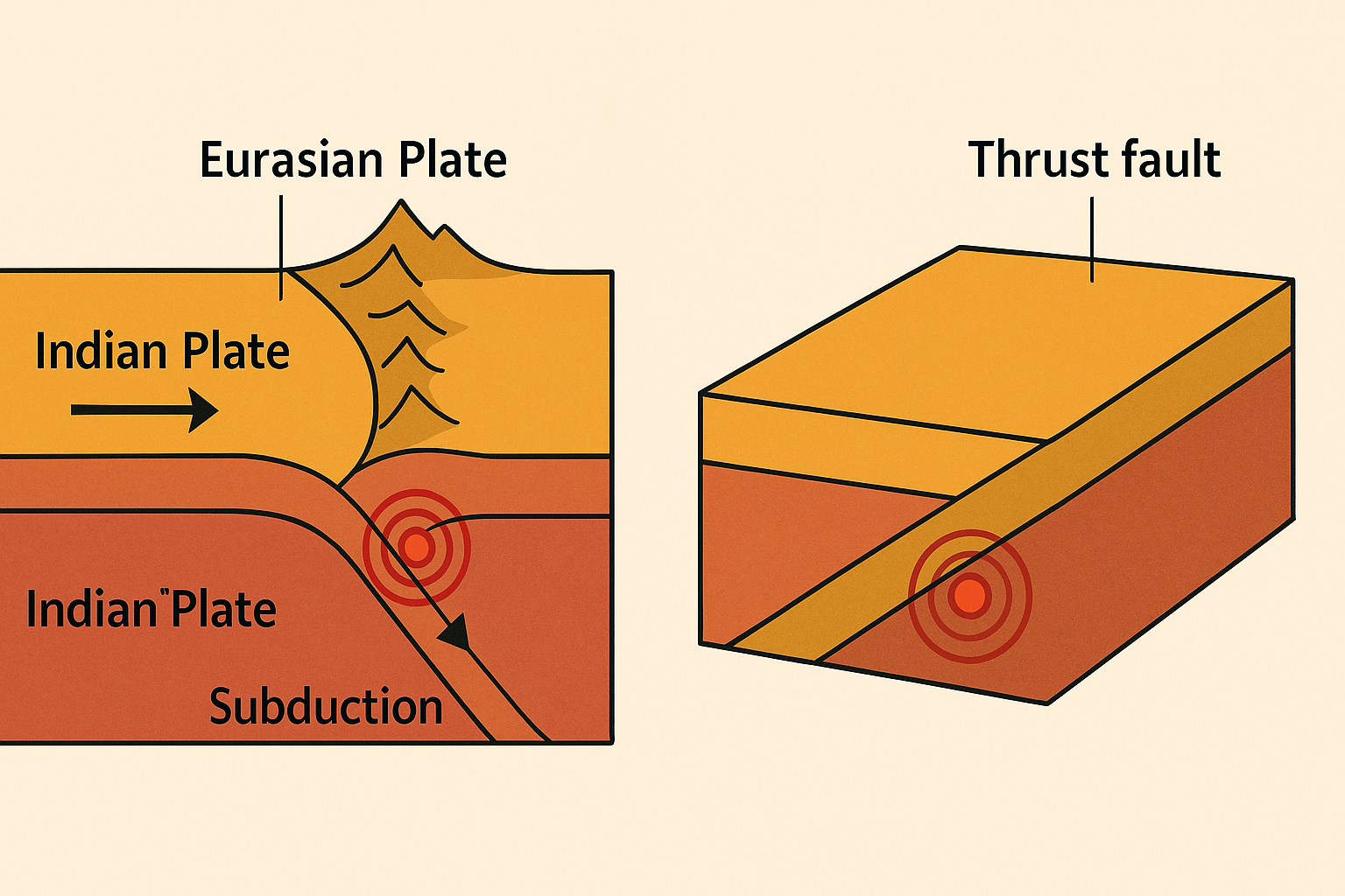 - 인도판(Indian Plate)이 유라시아판(Eurasian Plate) 아래로 밀려 들어가는 섭입(subduction)이 진행됩니다.